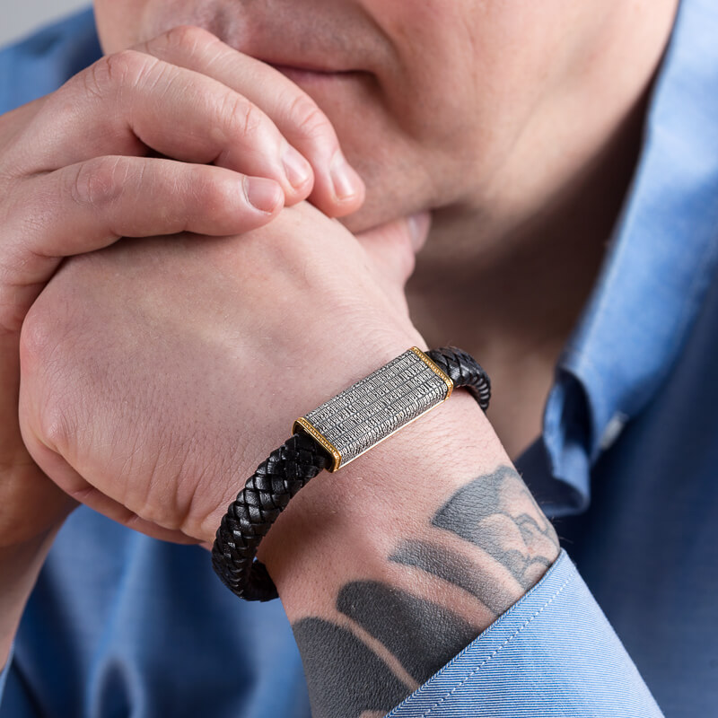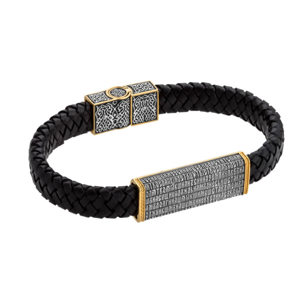 Несъемная широкая пластина на плоском кожаном браслете с магнитным замком заключает в себе полный текст молитвы «Отче Наш» — самое сильное известное обращение к Богу . Слова, произнесенные не человеком, не священнослужителем, а полубогом, имеют мощную силу. На протяжении веков молитвой «Отче наш» освещали утро и вечер, пели хором и тихонько произносили лично. В Евангелиях стих упоминается дважды: более краткий и постоянно дополняющийся вариант от Луки и полноценный, более распространенный, от Матфея.