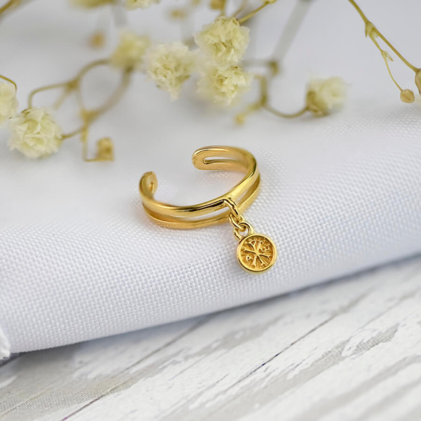 Колечко с монограммой Хризма, которая символически изображает Самого Господа Иисуса Христа. Монограмму дополняют греческие буквы альфа и омега. Это первая и последняя буквы греческого алфавита, которые указывают на значимость Бога для жизни всего мироздания. «Аз есмь Альфа и Омега, начало и конец, — говорит Господь, Который есть и был и грядет, Вседержитель».