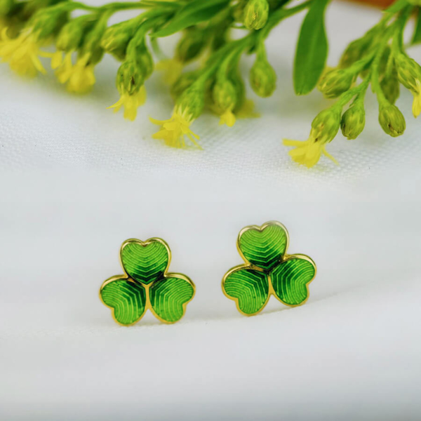 Позолоченные серьги-гвоздики с эмалью в виде нежного и неприхотливого клевера, который стал символом христианских добродетелей: веры, надежды, любви.